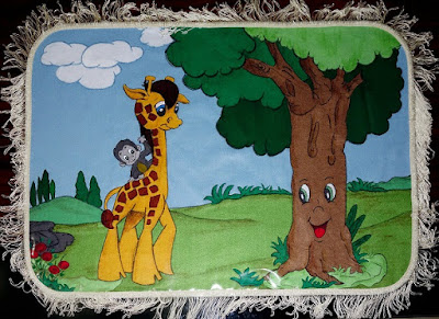 O tapete teve o desenho adaptado pelo Lucas, meu irmão, e é todo feito em feltro. Todos os itens são aplicados com pedaços de feltro recortados nas cores escolhidas, realçados por pintura, de modo a mostrar todos os detalhes da cena.